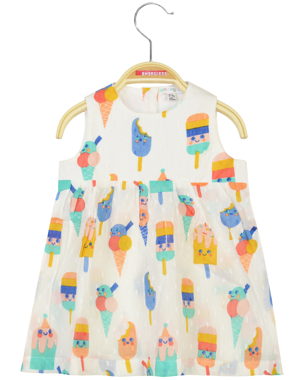 Αμάνικο φόρεμα εμπριμέ τύπωμα παγωτά. Στη μέση έχει σούρα και βαμβακερή φόδρα